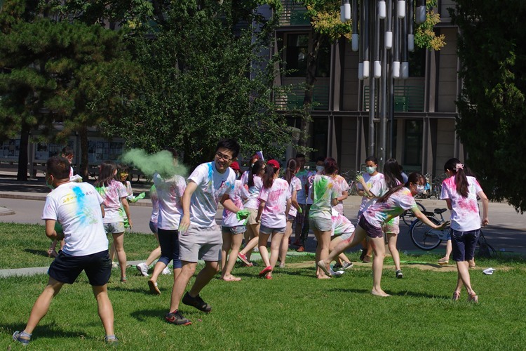 的两年生活什么最令你难忘”等系列问题的回答五花八门,从男神、女神、学霸、恋爱等话题展开,各种妙论迸出,欢乐多多,也诠释了什么叫做“教你难忘”;品园五舍男生楼前的蓝色畅想站,欢乐的高潮一波盖过一波。有了前几站的积累,每个参赛人员都已是色彩纷呈;来到人大的标志性建筑明德楼前,每个人在这个加油站拍照留念,定格下美好的瞬间;知行三楼的流金岁月站则是女生的天下,无所拘束,相拥而笑,天真烂漫,知行楼群间的欢声笑语想必已是深深印刻在每个人心中。最为壮观的当属大气国学馆前的“万紫千红”站,绿、蓝、粉、黄、红五色齐上,欢快的音乐夹杂其间,场面蔚为壮观。