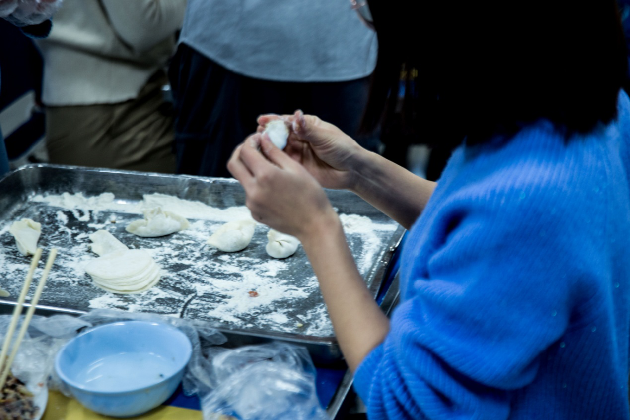 老师同学们分工协作,分别在几张桌子旁围成圈,取馅、沾水、封口、捏褶,忙的不亦乐乎。学院党总支书记张晓京老师一边和大家唠着家常,一边动手做示范,老师同学们个个得心应手,技法娴熟。大家来自全国各地,纷纷各显神通,包出有自己家乡特色的饺子,波波饺、月牙饺、东北饺,小小的圆形面皮与馅料组合在大家手中变幻出各种形状。包饺子不是那么熟练的同学也毫不示弱,有的同学认真学着,包出的饺子逐渐有模有样;有的同学很有天赋,第一次上手便包出了很不错的饺子;还有的同学本来快把包饺子技能给忘了,在活动中也慢慢找回了手感,再现当年雄风。