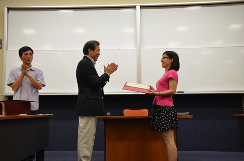 8月10日,研修班举行结业仪式。同志社大学社会学院院长富田安信教授出席并为我院代表团同学颁发结业证书。