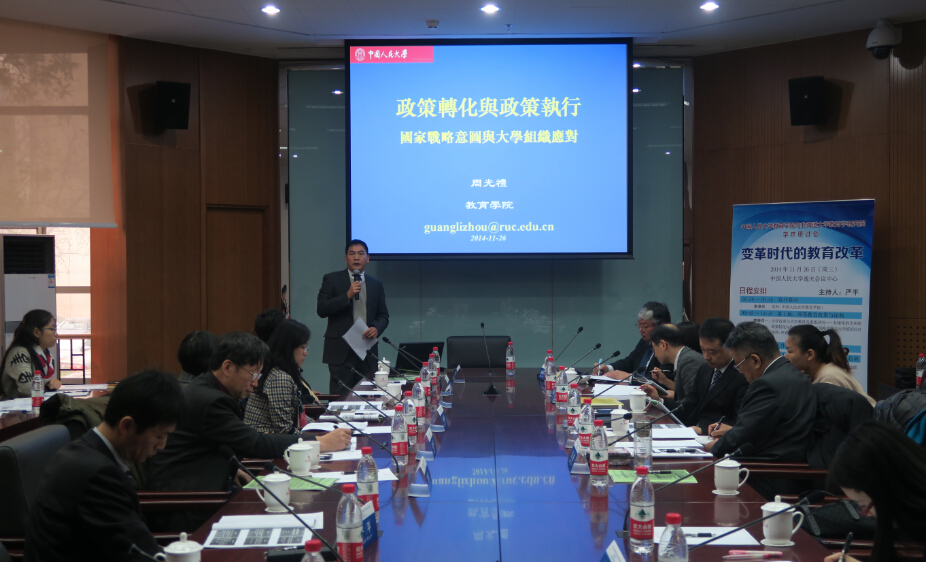 在上午的第一阶段,姊崎洋一(Anezaki Yoichi)教授和周光礼教授分别以“大学改革与大学教育的重组动向——全球化的光和阴”和“政策转化与政策执行——国家战略意图与大学组织应对”为题发言。申素平教授和张伟助理教授分别进行了点评。