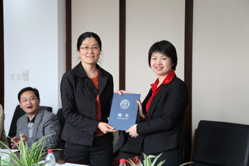 执行院长胡娟教授向王凤玲教授颁发了兼职教授聘任证书,同时与会学生代表为王凤玲教授佩戴巴卡漫画
