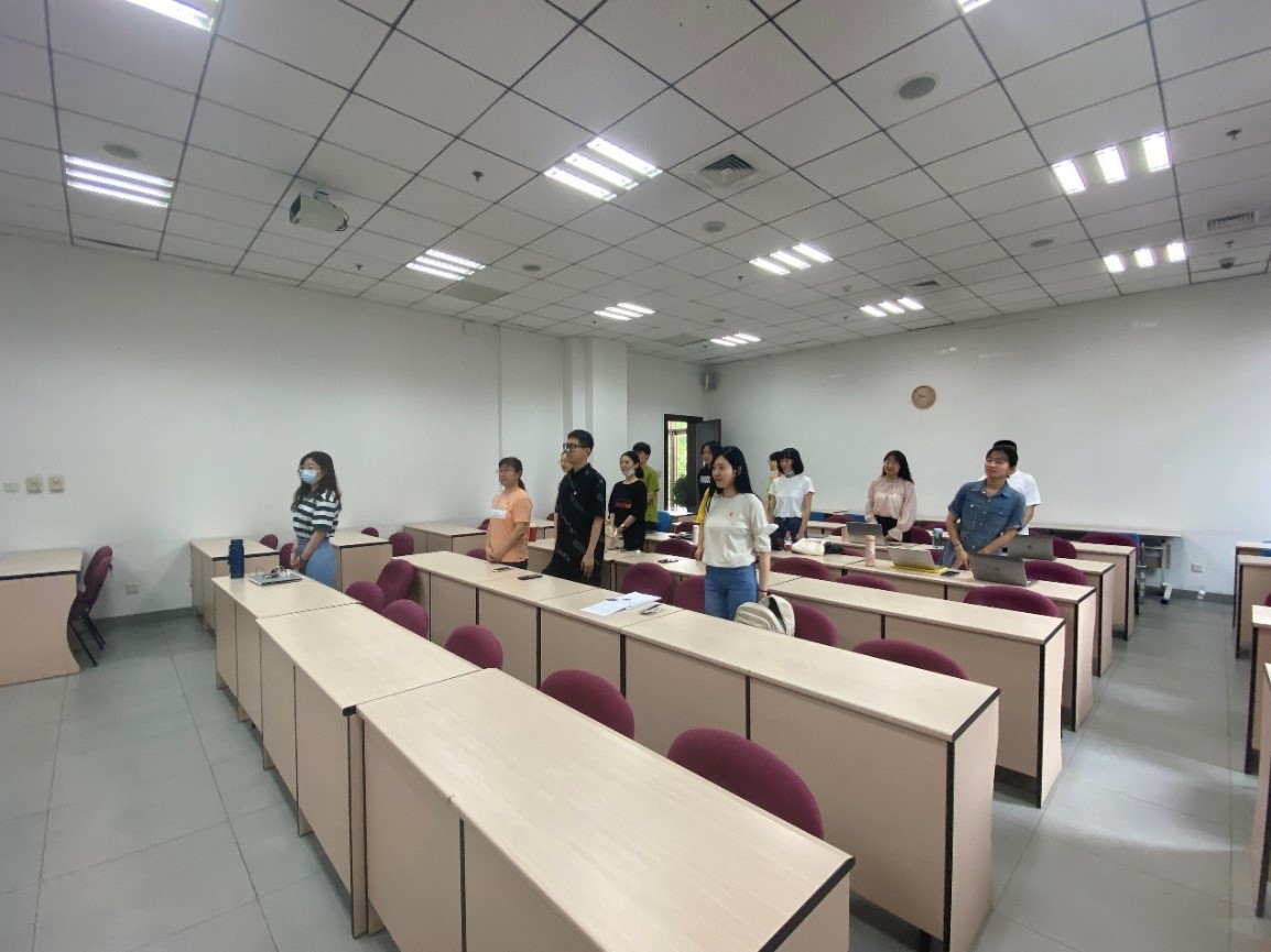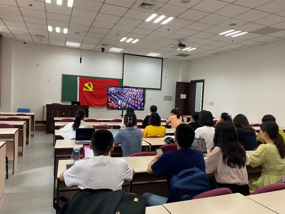 仪式伊始,现场全体参会人员起立,奏唱《中华人民共和国国歌》。在学院观看直播的老师同学们也一并起立,跟唱国歌。