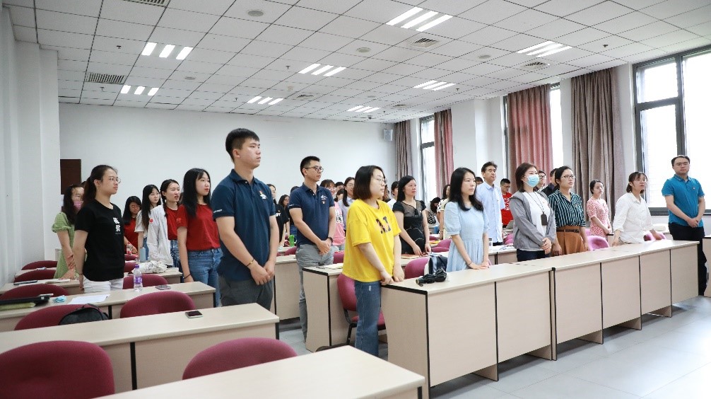 大会伊始,现场全体参会人员起立,奏唱《中华人民共和国国歌》。在学院观看直播的老师同学们也一并起立,跟唱国歌。