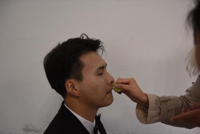 参赛师生在明德国际楼307教室备场,女生一袭红裙明艳动人,男生一身西装英姿飒爽,妆容要精致、衣着要整齐,比赛在即,参赛选手们积极筹备、紧张有序。