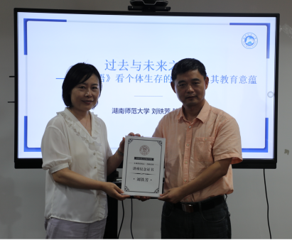 申素平教授为刘铁芳教授颁发讲座纪念证书,部分参会师生进行合影留念。
