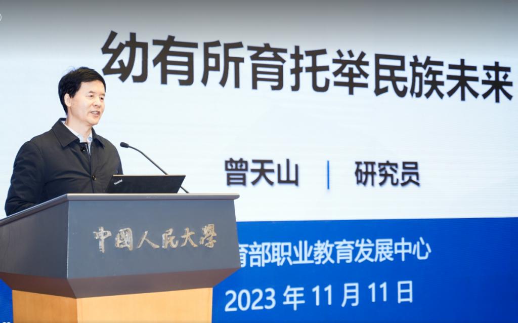 曾天山以“幼有所育托举民族未来”为题,强调建立普惠托育服务体系的紧迫性,指出当前师资资源存在严重不足的难题,解决之道在于卫健部门、人社部门、教育部门协同合作,遵循教育培训一体化、“岗课赛证”综合育人的基本原则,充分发挥信息化的作用,科学合理地解决托育人才培养与供给问题。