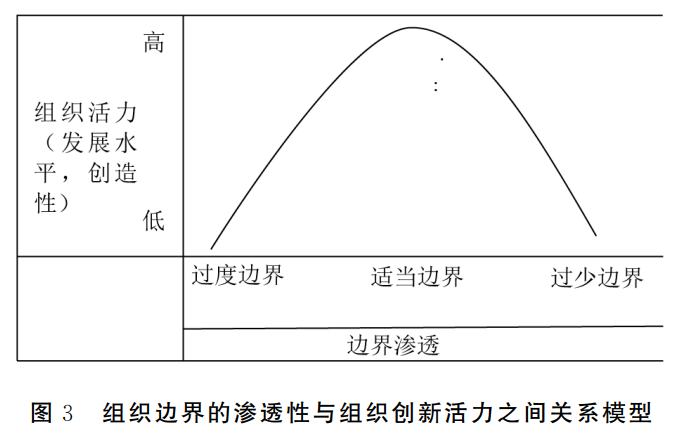 传统意义上的“界”多指地理意义上的界线划分,如两个地区分界的线,或不同事物的分界。然而,伴随信息化、数字化在高等教育领域的不断渗透,大学治理逐渐突破传统的组织边界,助推学科治理、学校治理走向知识中心的网络化治理。在这一过程中,大学治理主体的核心不再局限于教师、学生、行政管理人员等大学内部成员,而是突破了大学的内部治理结构层面,指向更为广泛的群体。大学跨越区域、层级、部门等界别限制,如不同行政区域的地理边界,大学与大学之间的界线,线上和线下的虚拟界线,大学与政府、市场、社会、企业、公众等之间的组织边界等,参与治理的跨界行动者在知识创新活动中达成共识,并采取协作行动,旨在实现共同目标——知识创新,增进公共利益。[10]然而,大学组织并不像政府组织、军事组织、社会组织或企业组织那样,学术性作为其本质属性,决定了大学组织边界必须保持在一定的适当范围内,既要开放,又要有一定的边界。组织边界既要将组织与周围环境分隔开来,又要将组织与周围环境之间连接起来,从而在组织自主性与环境适应性之间达至平衡。作为多元化治理主体的跨界行动者,只有在协作行动中不断提高自身跨越组织边界的能力,跨界治理行动才能得以实现。所以,只有不断提高组织对环境的适应性,跨界行动者才有望获得外部环境的支持而增强其存在和发展的合法性基础。然而,在平衡组织自主性与环境适应性的过程中,跨越组织边界既可能会创造和提高组织的自主性,也可能会有意或被迫削弱和降低组织的自主性。[11]从这个意义上看,大学治理领域的跨越组织边界意在强调在环境适应性与组织自主性之间保有一定的张力。事实上,组织边界的渗透性与组织活力(发展水平和创造性)之间存在着“倒U型”关系。当组织的边界渗透性适中时,才能更有效地激发组织的活力,提高组织的发展水平和创造性,相反,组织边界的渗透性无论是过强还是不足,都不利于组织活力的有效发挥(见图3),大学组织更是如此。在大学作为一个开放的创新创业系统的新格局下,大学组织与外部环境之间应保持适当的张力,将大学组织边界保持在适当位置,既要开放,又要保有一定的组织边界。也就是说,面向知识创新需求的大学治理,需要大学与政府、市场、社会、企业、公众等相关利益主体之间架构起更为紧密的松散耦合关系,如此方能有效激发大学组织的创新活力,提高大学组织的发展水平,提升大学组织的创新创造能力和效率。换言之,在外部环境的影响下,大学要保持相对的独立性和自主性,边界不能无限制向外部环境开放。大学组织的边界既要保持向政府、市场和社会开放,同时也要保持大学自身的封闭空间。事实上,大学既是一个开放组织,也是一个封闭组织,既是个社会服务站,同时也有“象牙塔”属性。[12]