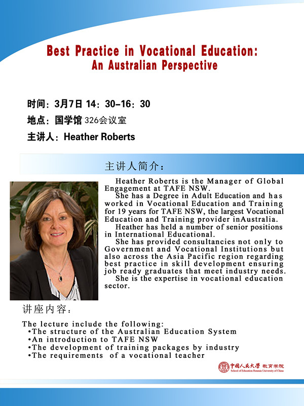 讲座:3月7日Heather Roberts——职业教育的最佳实践(澳大利亚的视角)