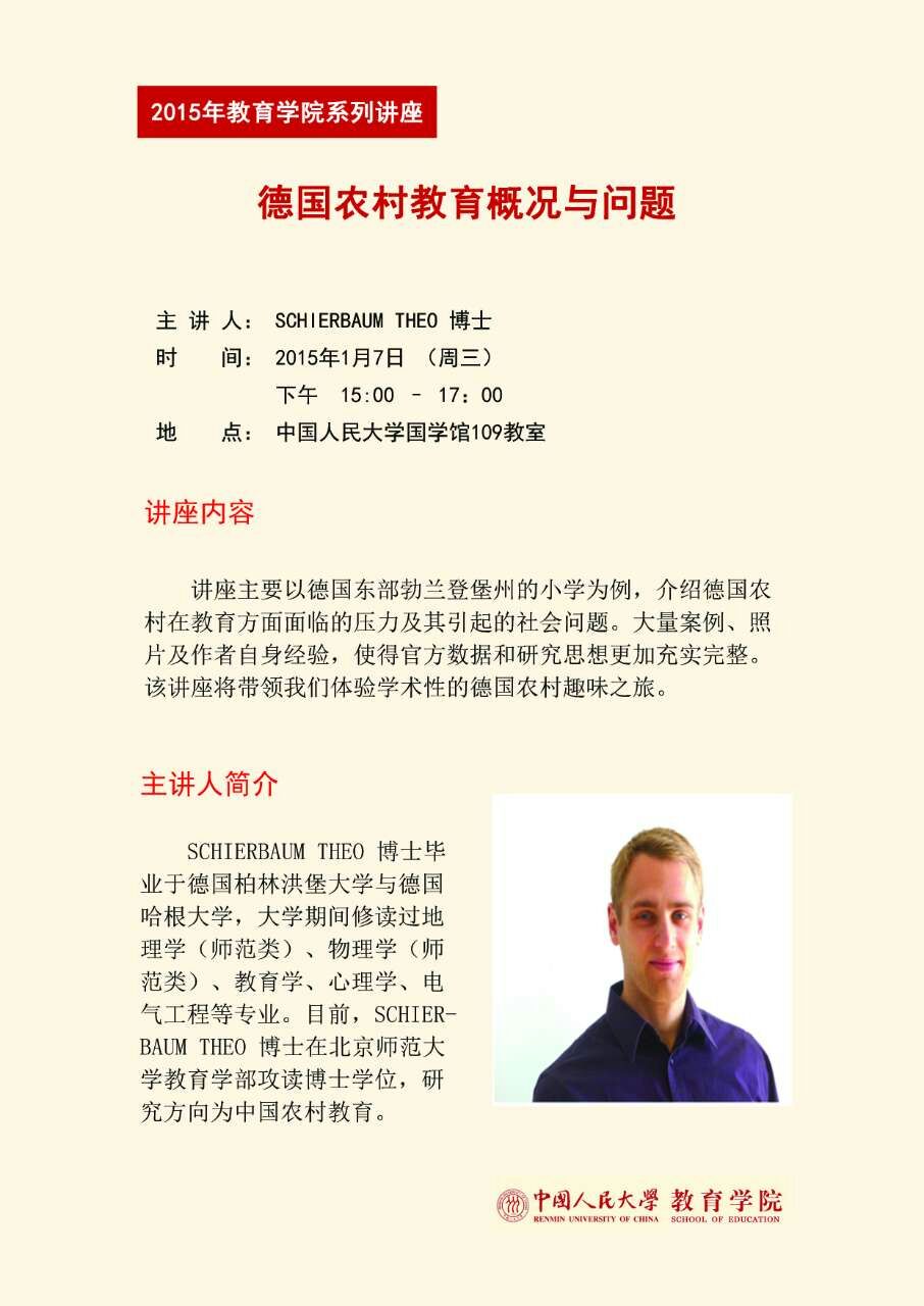 SCHIERBAUM THEO(体奥)博士,毕业于德国柏林洪堡大学与德国哈根大学,地理学(师范类)、物理学(师范类)、教育学、心理学、电气工程专业。目前,在北京师范大学教育学部攻读博士,研究方向为中国农村教育。