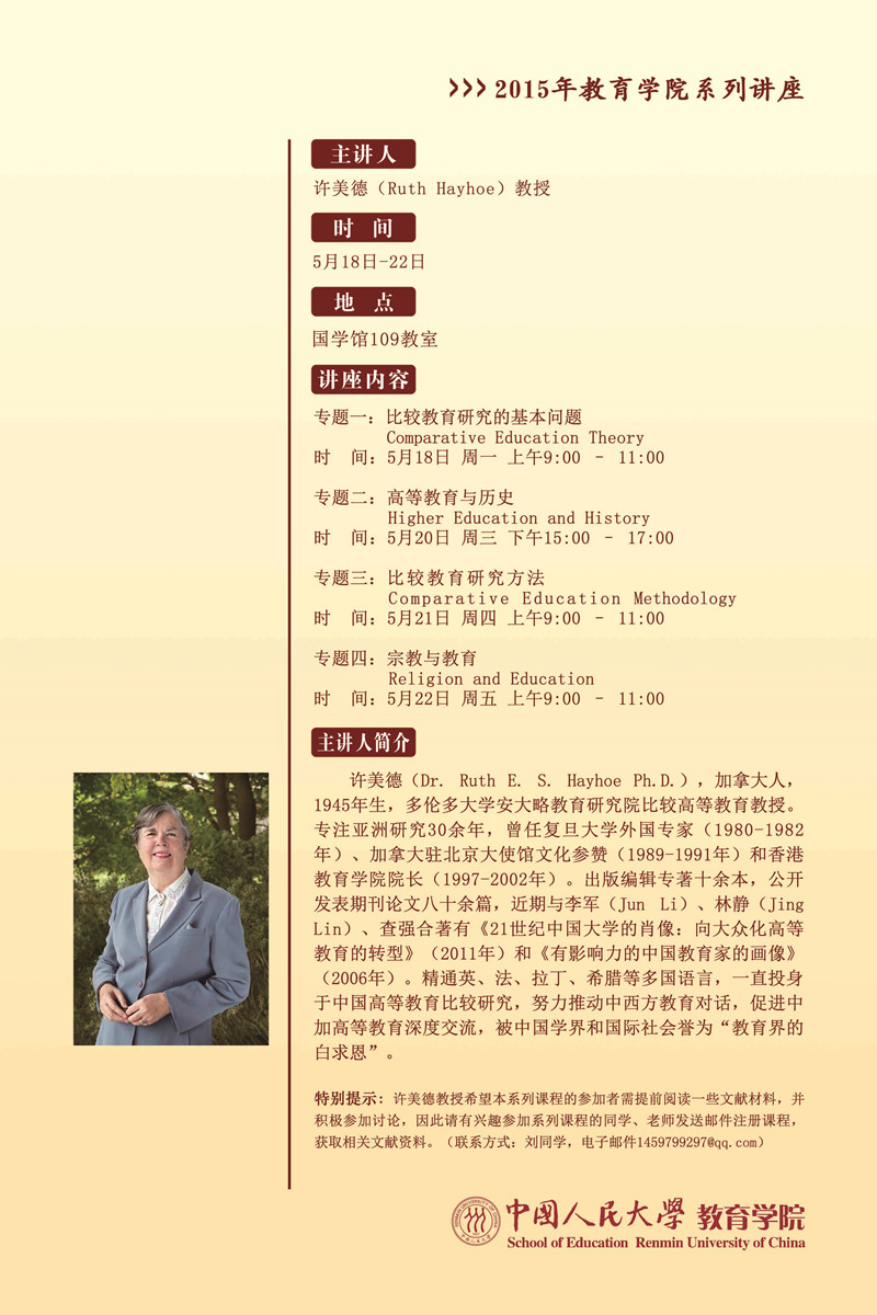 加拿大著名比较教育学家Ruth Hayhoe(许美德)教授将来我院进行为期一周的短期讲学,欢迎老师、学生参加。